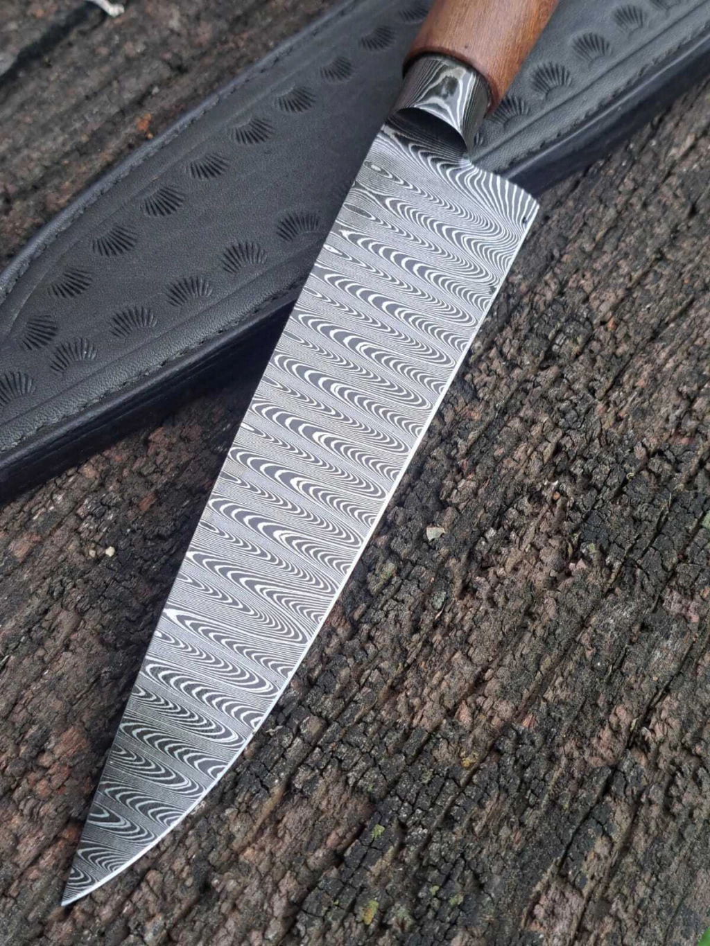 Descubre la exquisitez del Cuchillo Damasco con hoja de 15 cm, realizado en acero multilaminado Damasco. Este impresionante cuchillo está compuesto por 1070 y 15N20, siguiendo un elegante patrón ladder, lo que no solo proporciona una estética cautivadora, sino también una resistencia excepcional.
