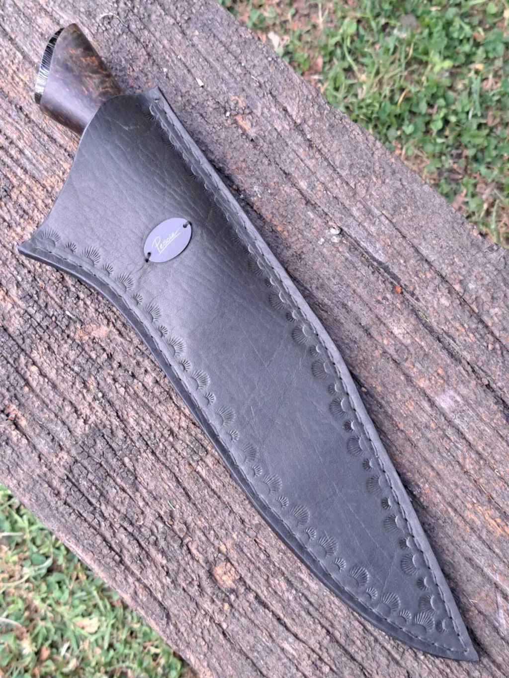 Su cabo en guayacán o Urunday ofrece un agarre cómodo y seguro, mientras que la vaina de cuero baqueta garantiza un transporte elegante y protegido. Cada cuchillo es 100% hecho a mano, lo que implica un tiempo de fabricación de entre 30 y 40 días.