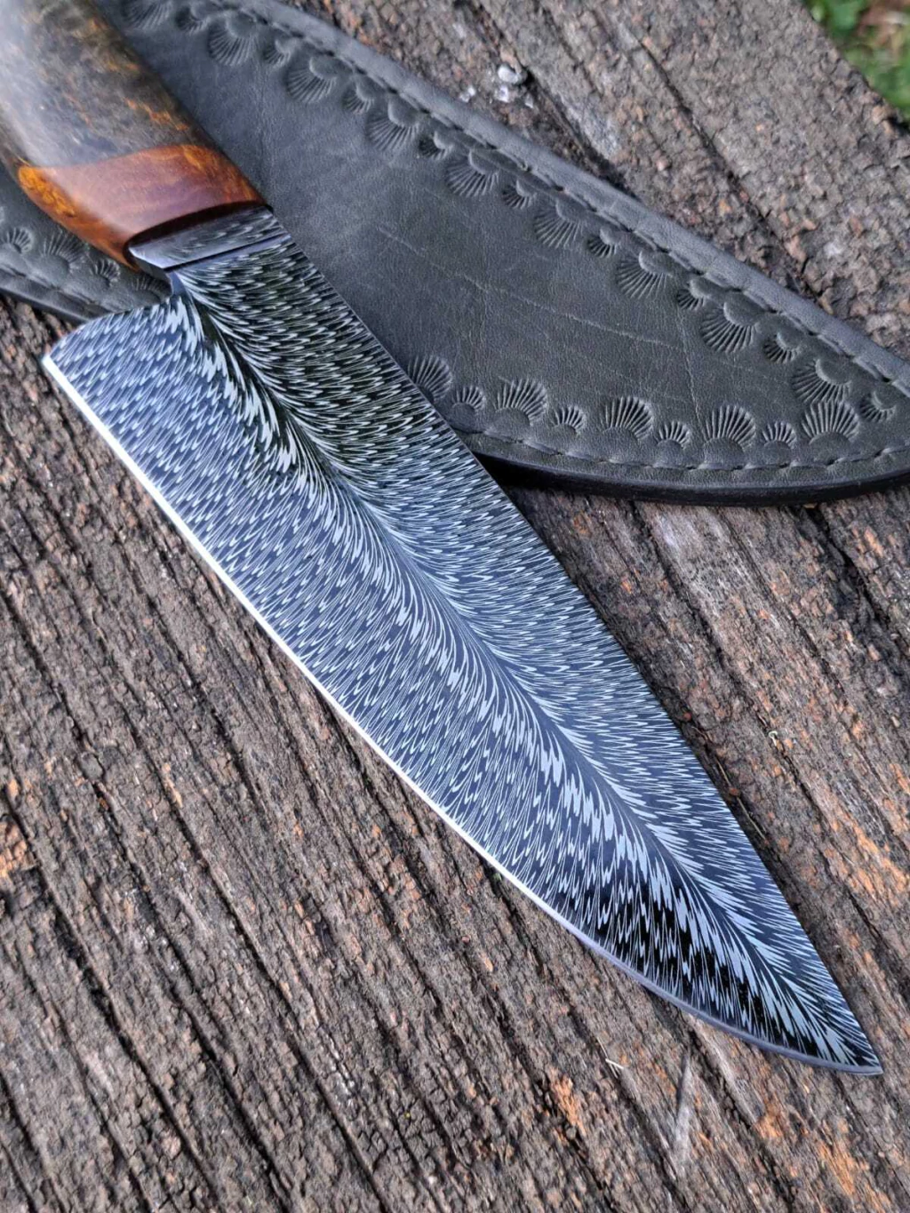Descubre la exquisitez del Cuchillo Damasco con hoja de 17 cm, realizado en acero multilaminado Damasco. Este impresionante cuchillo está compuesto por 1070 y 15N20, siguiendo un elegante patrón Pluma, lo que no solo proporciona una estética cautivadora, sino también una resistencia excepcional. Con un Pomo en damasco