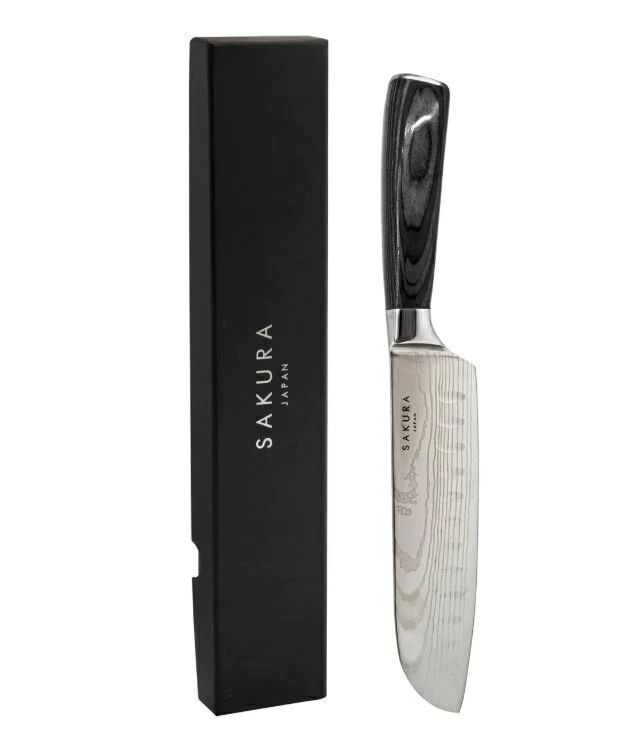 Elegante cuchillo Sakura santoku, realizado en acero inoxidable y resistente a las manchas. Su mango es completamente ergonómico, lo que permite un equilibrio adecuado, como también, una facilidad de movimiento y reducción de tensión de la muñeca a la hora de uso. Se recomienda lavar con agua tibia y un detergente suave; enjuagar y secar inmediatamente. Como la mayoría de los lavavajillas son extremadamente abrasivos, recomendamos lavar a mano.