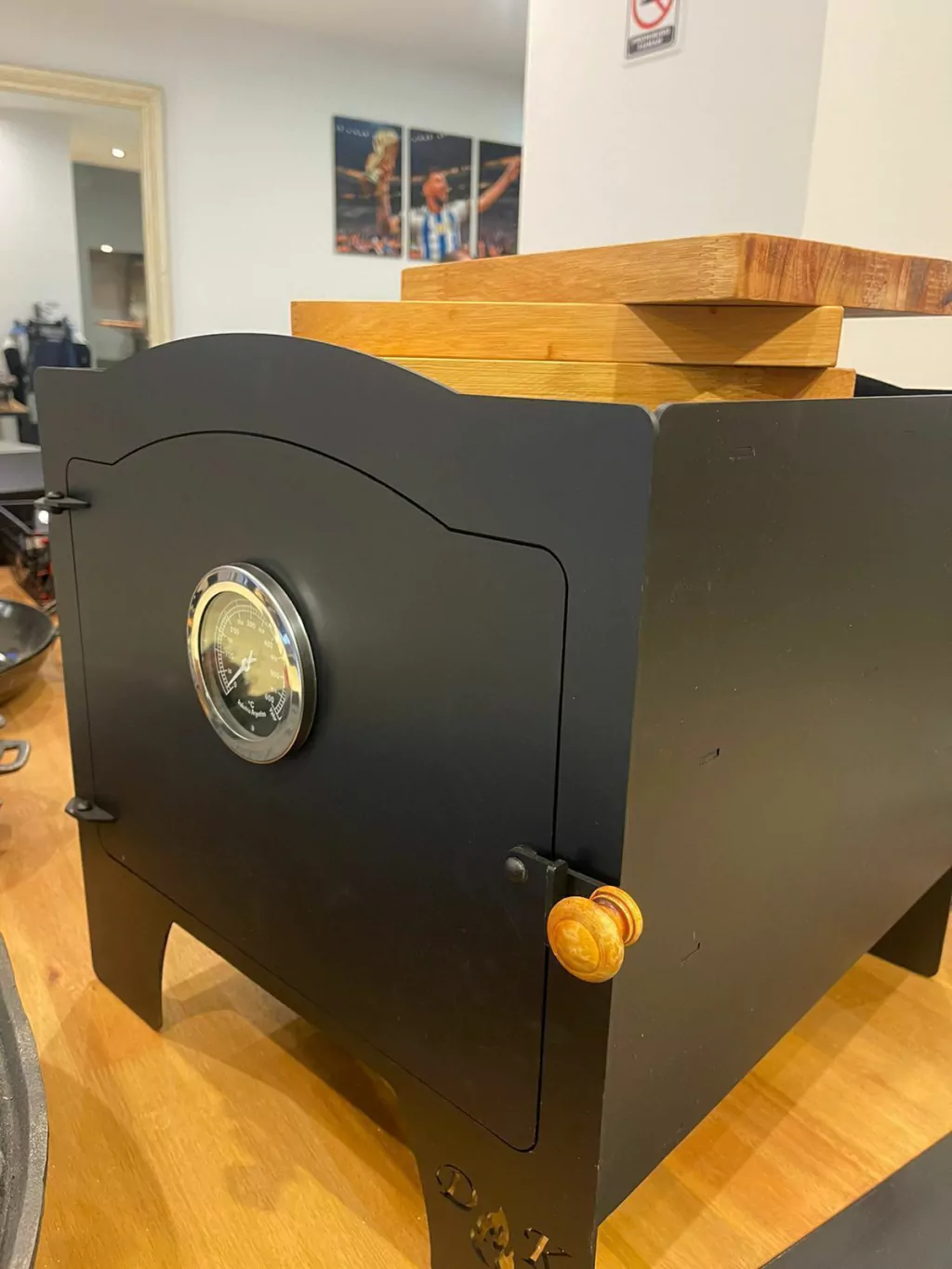 chapa de 3,2mm, todas piezas cortadas por láser, encastradas y soldaduras técnicas mig. Pintura exterior de alta temperatura hasta 600°, interior curado con aceite comestible común. Peso: 26kg.