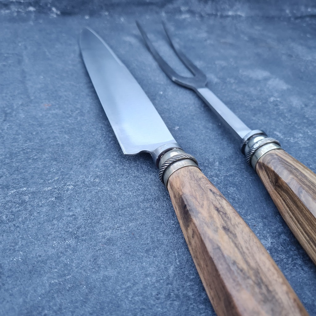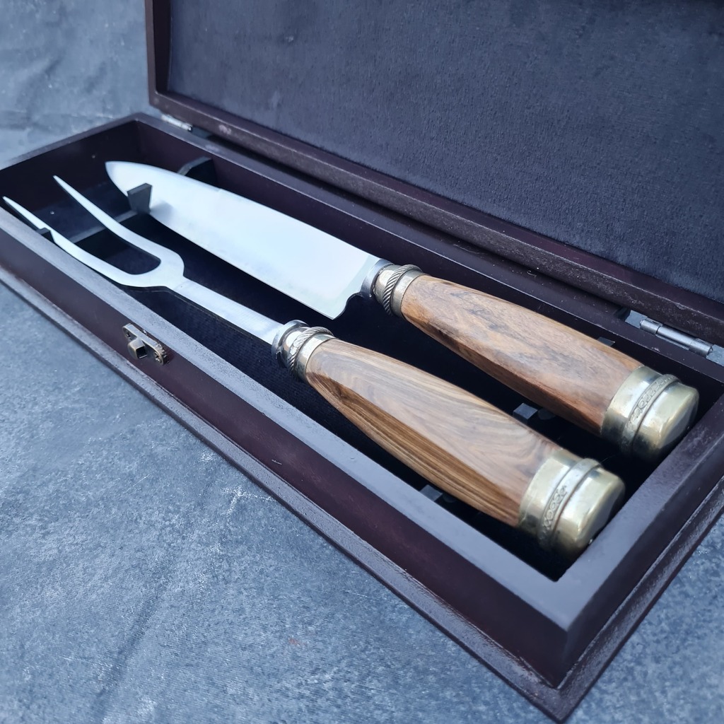 Cada pieza cuenta con un mango de guayubira, complementado por un botón y virola de alpaca pura, que añaden un toque de distinción a tu mesa. Además, su presentación en una caja de madera no solo asegura un almacenamiento perfecto, sino que también lo convierte en el regalo ideal para cualquier ocasión.